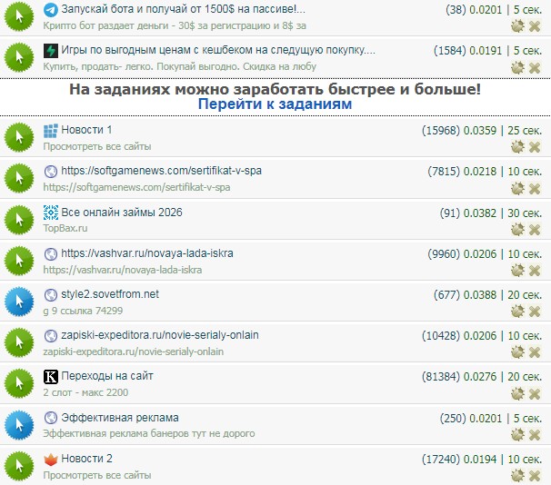 Заданий много, даже есть задания от 150 рублей. Если вы только начинаете выполнять задания, выбирайте самые лёгкие задания от 50 копеек. Задания от 50 копеек выполнять не сложно и уходить мало времени.