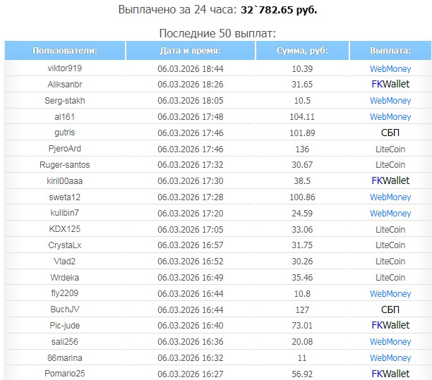 Каждый день пользователи работают, и зарабатывают свои деньги. Выплаты с сайтов моментальные.