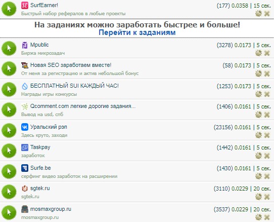 Зарабатывать вы сможете на заданиях, сёрфинг сайтов, переходам по сайтам, видео ютубе, расширение, опросы.