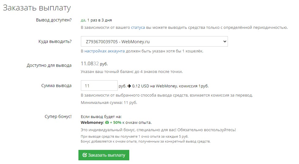 Вводим сумма для вывода, и нажимаем заказать выплату: