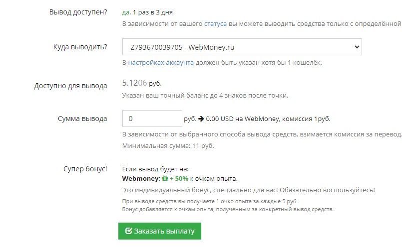 Выводить деньги можно на платёжные системы, но я заказываю на webmoney. На webmoney минимальная сумма для вывода составляет 11 рублей, выплаты моментальные с сайта.