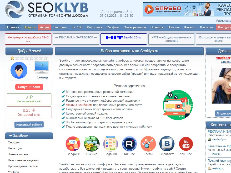 Привет друзья, ещё для вас не плохой русский букс для заработка в интернете без вложения - seoklyb.