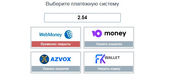 Сайт работает с платёжными системами: webmoney, azvox, юmoney, fkwallet.