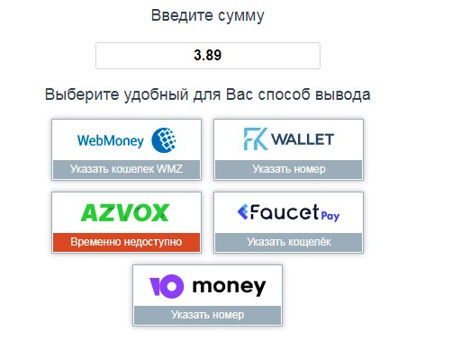 Выводить деньги можно на платёжные системы: юmoney, azvox, faucetpay, fkwallet, и webmoney.