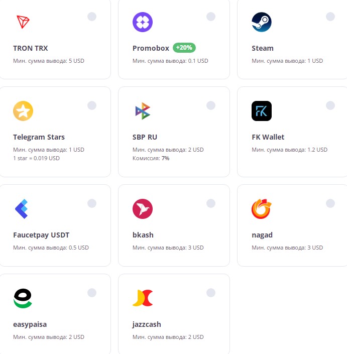 На сайте много разных платёжных систем куда можно выводить свои заработанные деньги: Tron trx, promobox, steam, telegram stars, sbp ru, fk wallet, faucetpay usdt, bkash, nagad, easypaisa, jazzash.