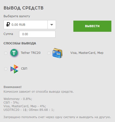 Выплаты доступны на webmoney, сбп, visa, и usdtrc20.