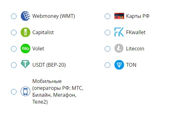 Выводить деньги вы сможете на webmoney, Capitalist, Volet, Usdt, Мобильную связь, Карты, Fkwallet, Litecoin, и Ton.